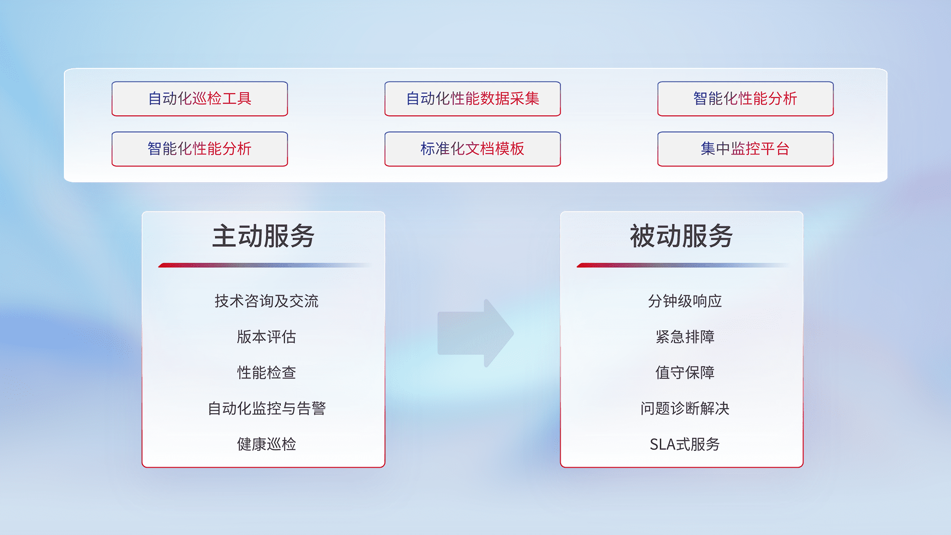 智能化工具和标准化文档,,,保障服务质量,,,提供主动服务(包含技术咨询、、、、版本评估、、性能检查、、、、自动化监控与告警、、健康巡检)和被动服务包含(分钟级响应、、、、紧急排障、、、、值守保障、、问题诊断解决、、、、SLA服务)。。